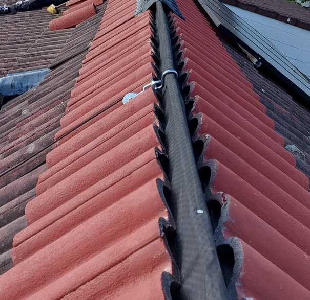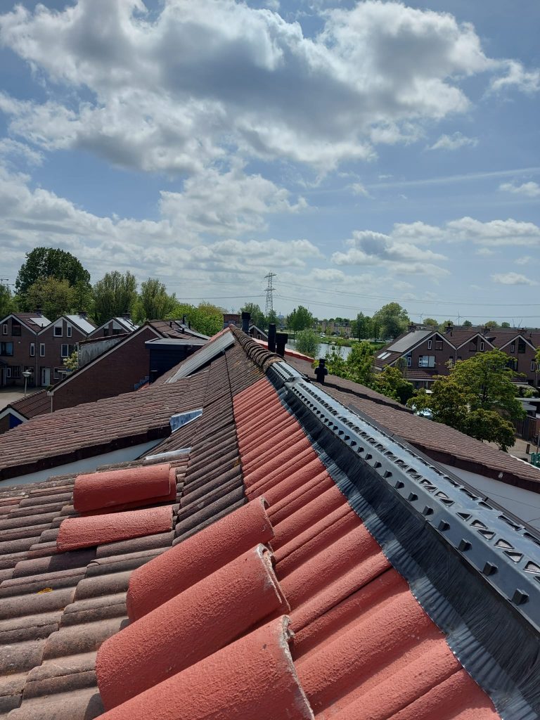 Beluchting is erg belangrijk om houtrot tegen te gaan. Geheel is opgebouwd in de volgorde spinvliesfolie (strook van 75 cm), ondervorst, en ondervorst element borstel zwart (dit is geplaats ter voorkoming van het losraken van ondervorst lijmstrook) en nokpan.