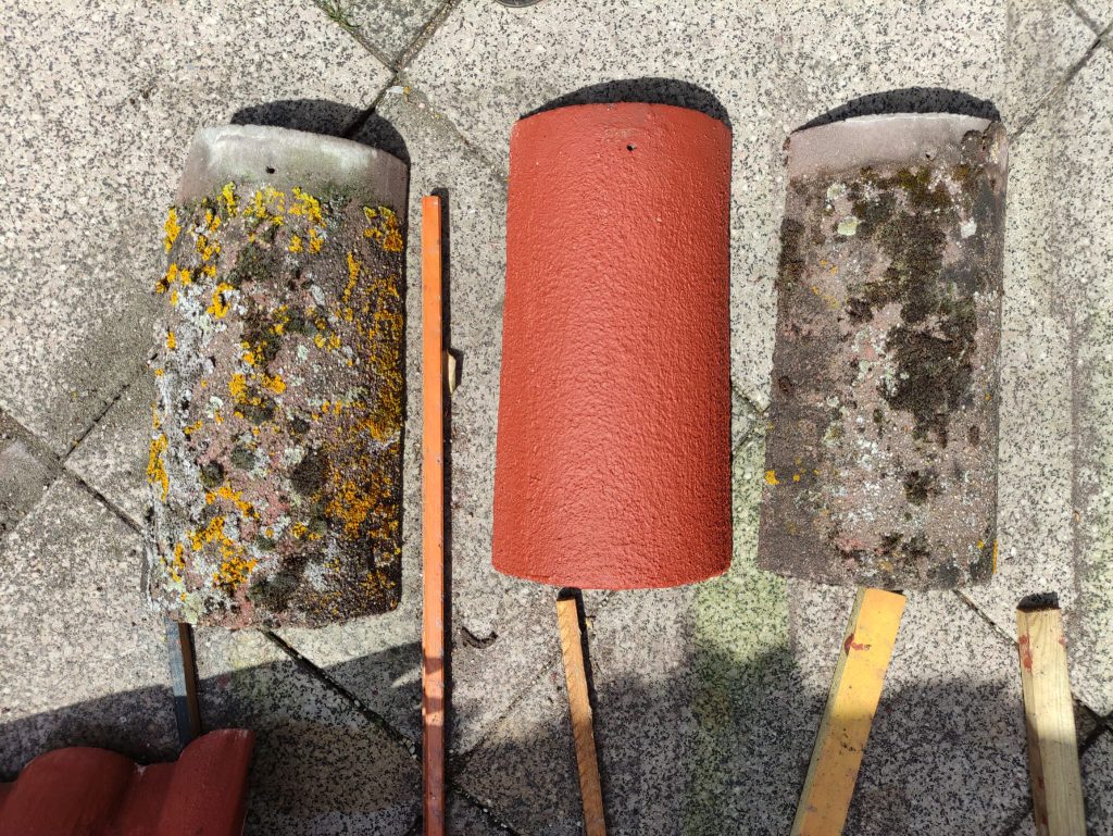 Oude dakpannen en nokpannen worden veelal vernietigd. Maar je kan ze weer helemaal nieuw maken door een buitenstuc laagje (Knauf 210 of Weber Beamix Cementgebonden stucmortel ) met coating aan te brengen.